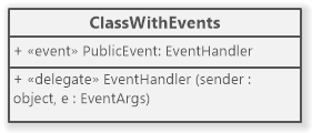 You can also model events and delegates using UML tool Software Ideas Modeler. Events are modeled as UML attributes with an event stereotype. Delegates are modeled as UML operations with a delegate stereotype.